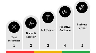 - 5 = Business Partner: IT is fully integrated into the business strategy. They take responsibility for outcomes and communicate effectively across all departments.